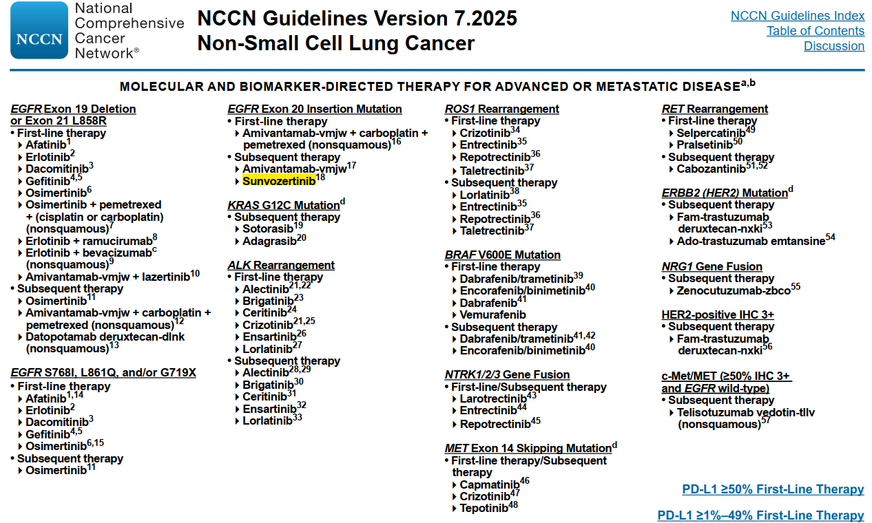 On July 10, 2025, NCCN released the latest update (Version 7.2025) of its Non-Small Cell Lung Cancer (NSCLC) Clinical Practice Guidelines, incorporating Sunvozertinib as a post-line therapy option for advanced or metastatic NSCLC patients with EGFR exon20 insertion mutations (EGFR Exon20ins). This recommendation applies to patients who have progressed after first-line treatment.