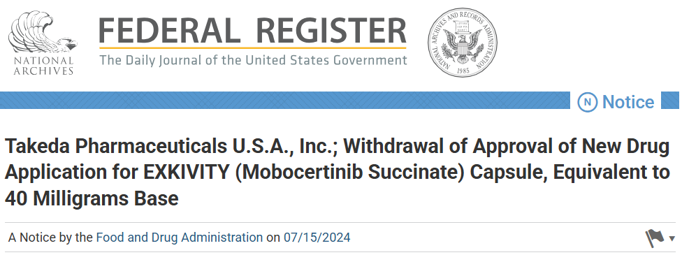 The FDA has accepted Takeda Pharmaceutical's voluntary withdrawal application for mobocertinib (EXKIVITY®)