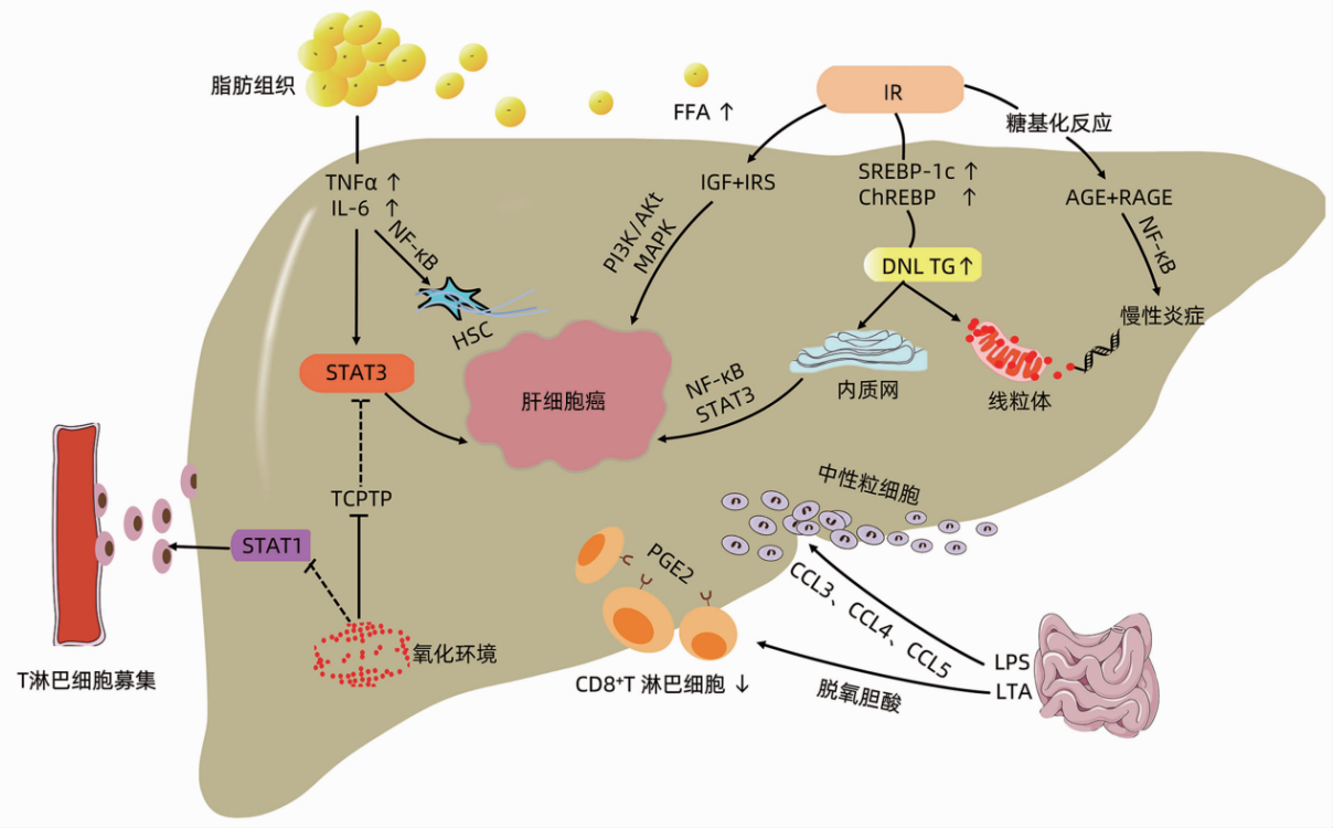 Excess energy stored in adipose tissue can promote the production of chronic inflammation in obese individuals. Inflammatory cytokines secreted by adipocytes and macrophages, such as tumor necrosis factor (TNFα), interleukin-1 (IL-1), and interleukin-6 (IL-6), are upregulated in obesity. TNFα and IL-6 activate the JAK/STAT3 oncogenic signal in non-adipose tissues, leading to uncontrolled hepatocyte proliferation and apoptosis, which promotes the occurrence of HCC.