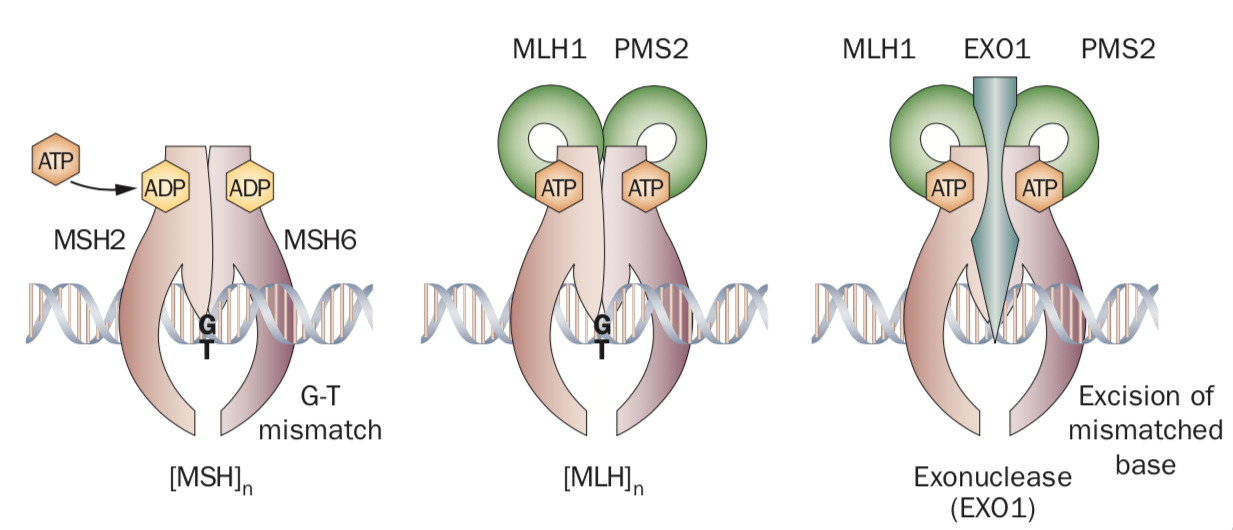 These genes belong to the mismatch repair (MMR) pathway, with MLH1 and MSH2 accounting for ~80% of cases. When these genes carry pathogenic mutations, they lead to deficient MMR (dMMR), increasing cancer risk. Since these mutations are germline (inherited), affected individuals carry the defect from birth, often leading to earlier-onset cancers.